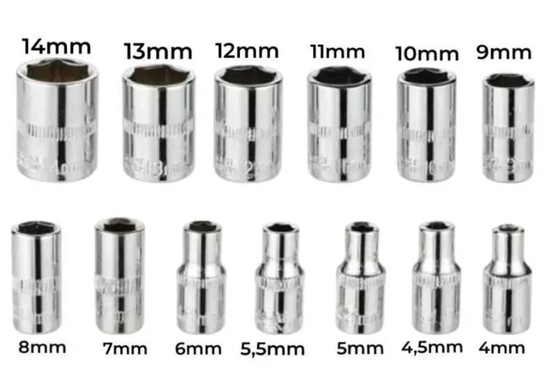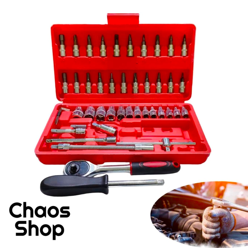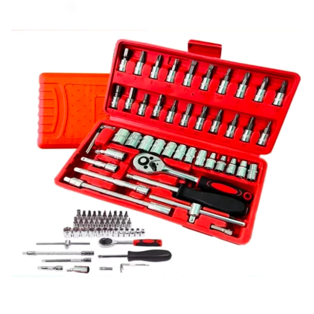 Este Kit de ferramentas conta com catraca, e um total de 46 peças de aço cromo vanádio, feitas para durar!