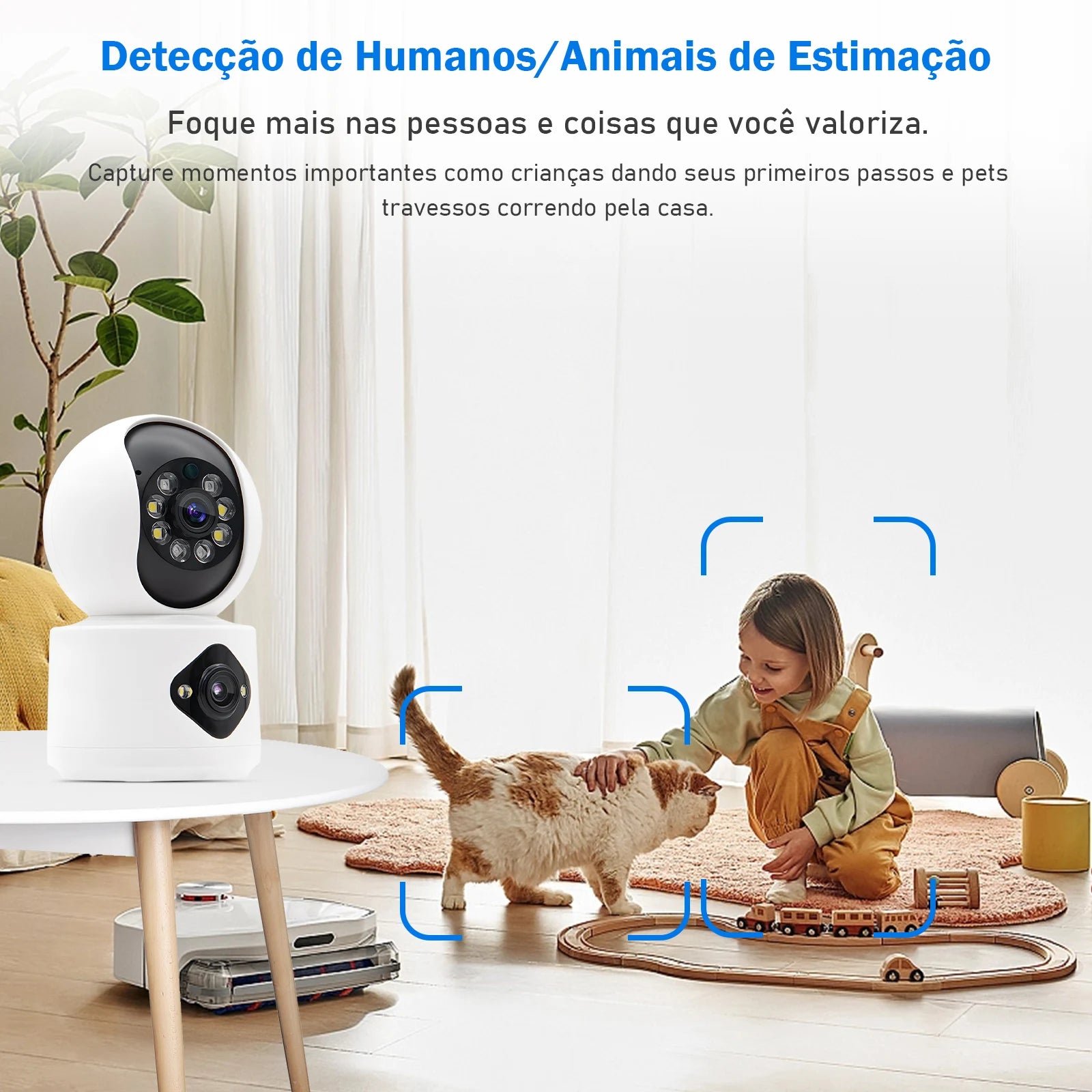 【Tecnologia Inovadora de Câmeras Duplas】: Esta câmera de monitoramento interna única possui duas câmeras de alta definição de 2 megapixels, oferecendo uma vigilância de duplo ângulo sem precedentes. Uma única câmera pode realizar as funções de duas câmeras convencionais, permitindo monitorar facilmente atividades na sala de estar ou na entrada da casa